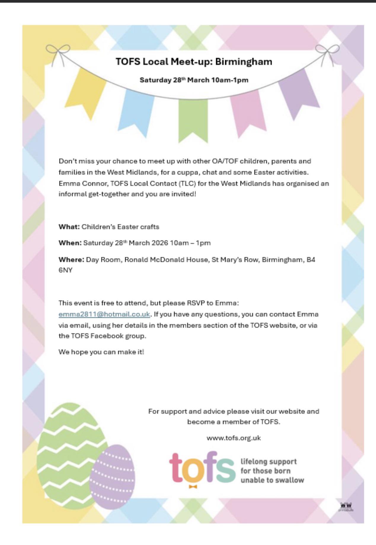 Don’t miss your chance to meet up with other OA/TOF parents and families in the West Midlands, for a cuppa, chat and some Easter crafts!